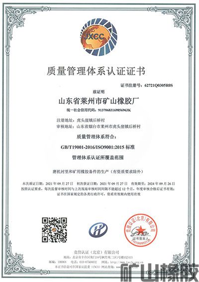 山東省萊州市礦山橡膠廠2003年率先通過ISO9001:2000質量管理體系認證;2018年再次通過山東魯源節能認證技術工程有限公司第三方辦理的GB/T19001-2016 / ISO9001:2015質量管理體系認證。